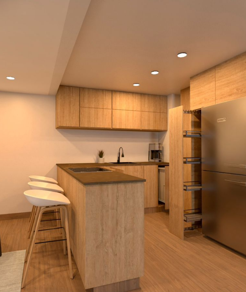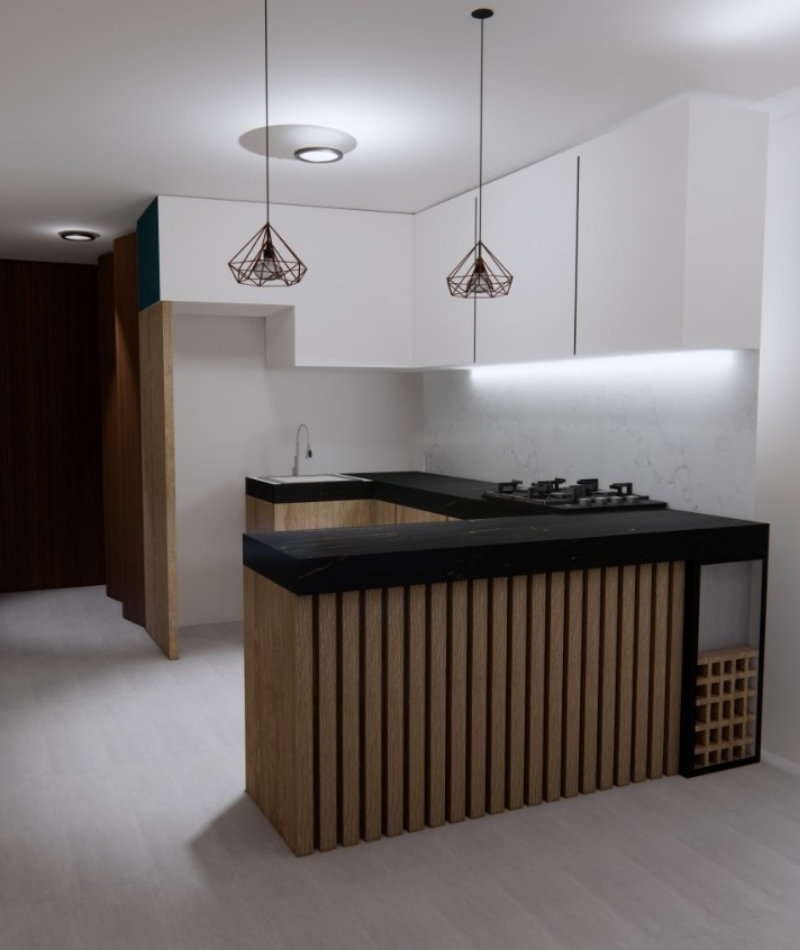 Remodelación integral de apartamento en obra gris, incluyendo diseño de interiores, acabados modernos y optimización de espacios. Se implementaron materiales premium y detalles personalizados en cocina, baños y zonas sociales.